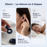 Conçus pour bloquer les bruits indésirables tout en restant confortables, les bouchons Silent+ permettent à votre cerveau de rester dans un état de calme, favorisant un sommeil plus profond, une meilleure récupération et une détente ininterrompue — même dans un environnement bruyant.